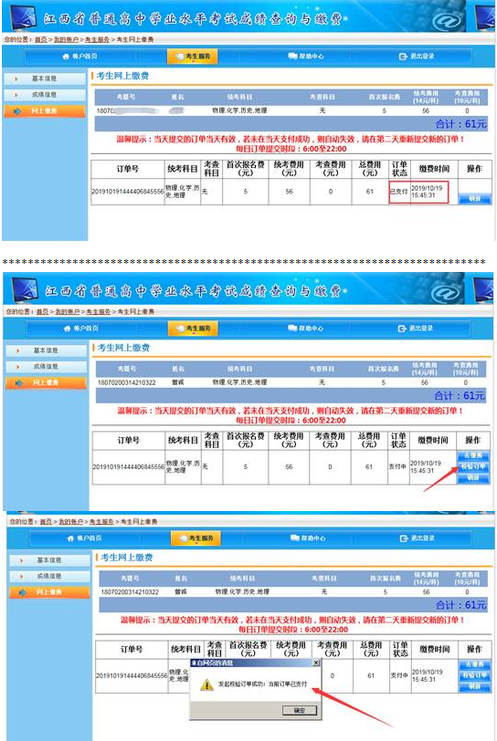 5.网上报名缴费。考生完成网上报名并现场确认后,初三年级考生须于3月17日至21日完成网上缴费,每日缴费时段为9:00-21:00。考生可根据网上报名系统界面提示进入“江西省政务服务统一支付平台”缴费,平台支持支付宝、银联云闪付以及江西银行、江西农信社、工商银行、农业银行、建设银行的网银支付。逾期未缴费则视为自动放弃报考资格,网上缴费完成后系统无法进行退费。初二年级考生暂不缴费。