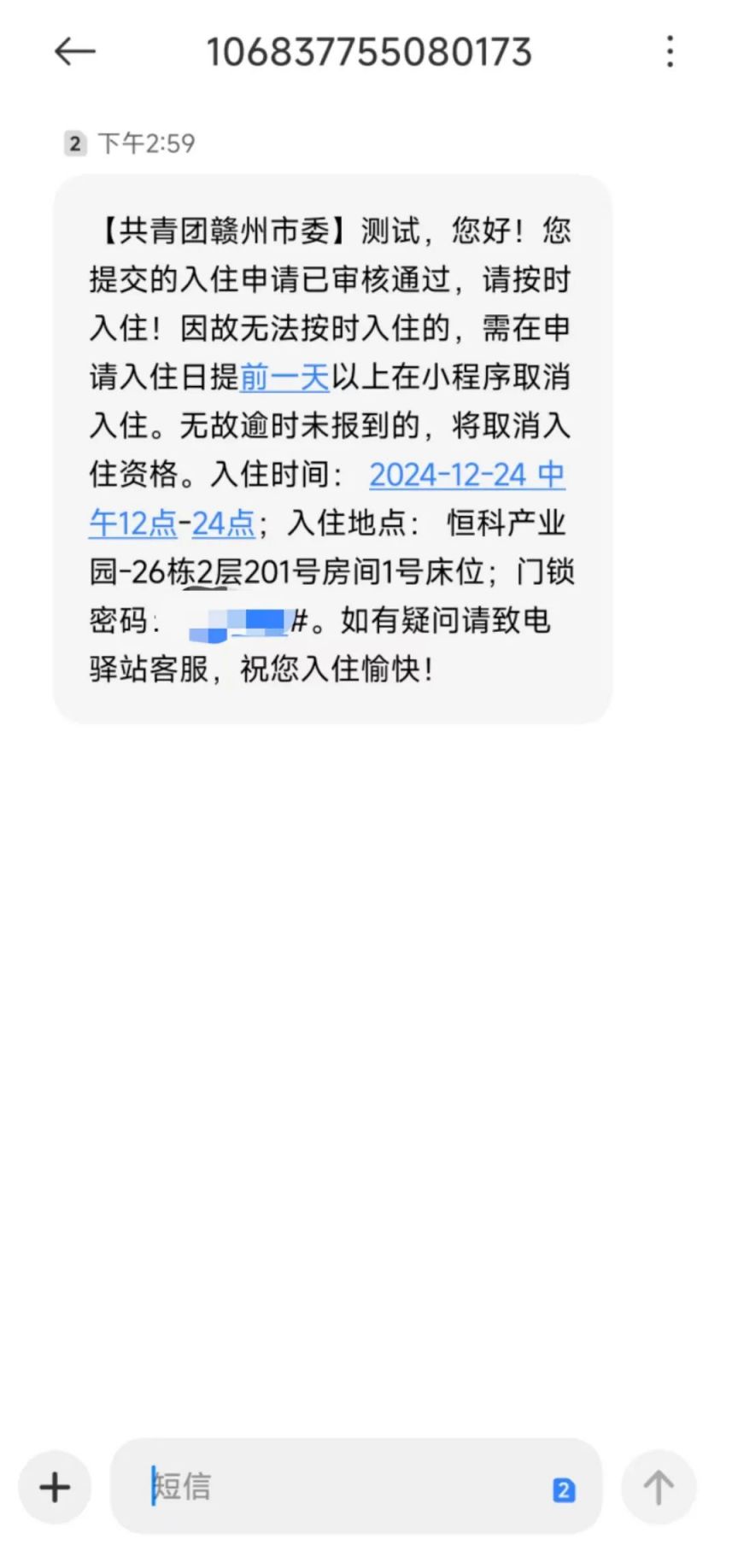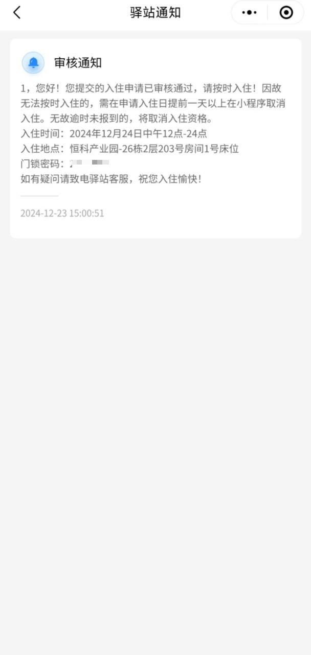 4.后台核验入住资格后通过申请,将收到【申请通过】信息,入住人员凭【房间密码】进行入住。