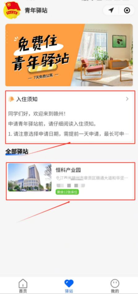 2.点击查看【入住须知】并在【全部驿站】下方选择【恒科产业园】驿站点。(目前第一期驿站点仅启动了恒科产业园站,第二期驿站点正在打造中,敬请期待!)