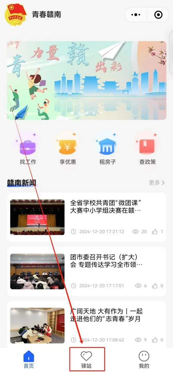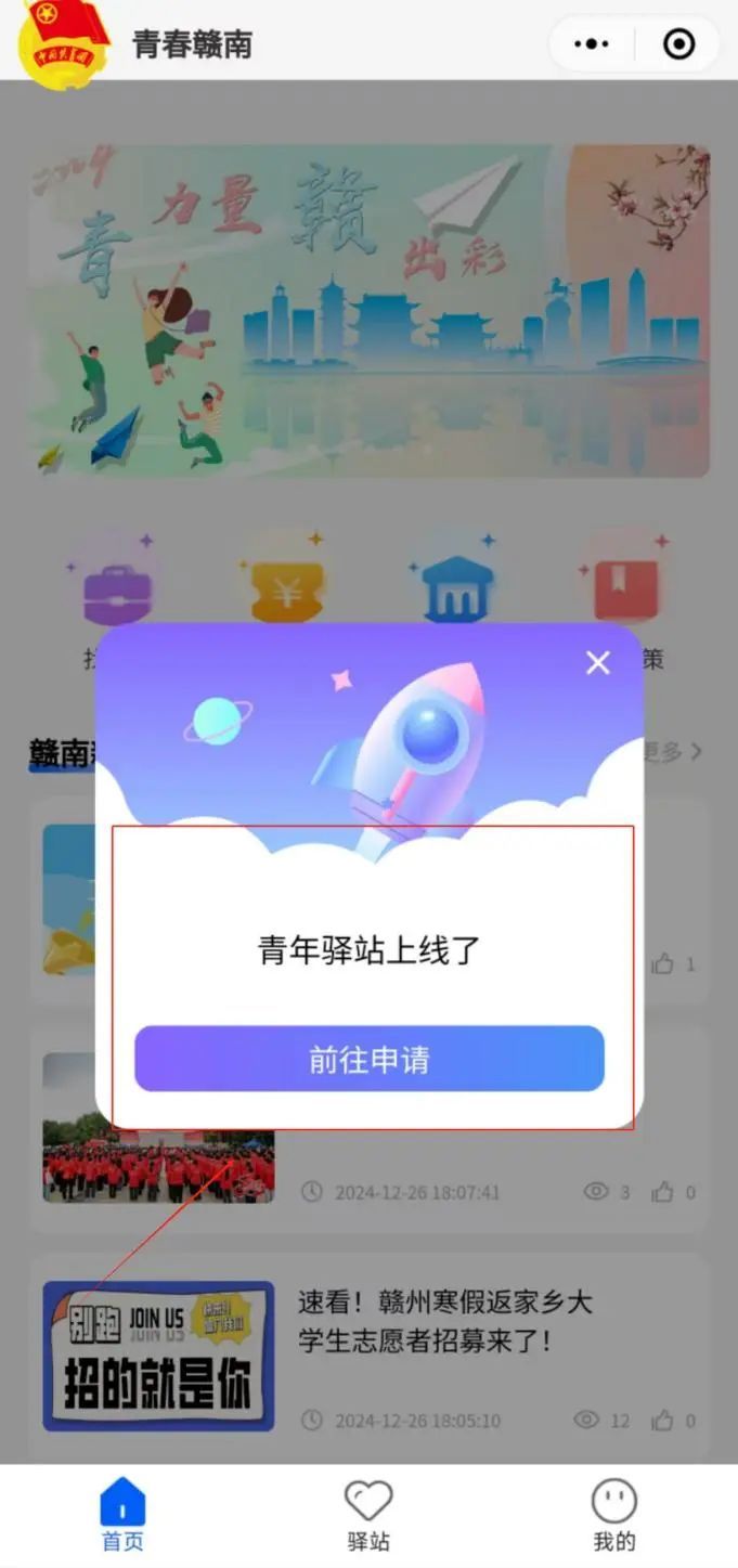 1、登入【“青春赣南”小程序】,点击进入首页【前往申请】弹窗或点击下方【驿站】专区