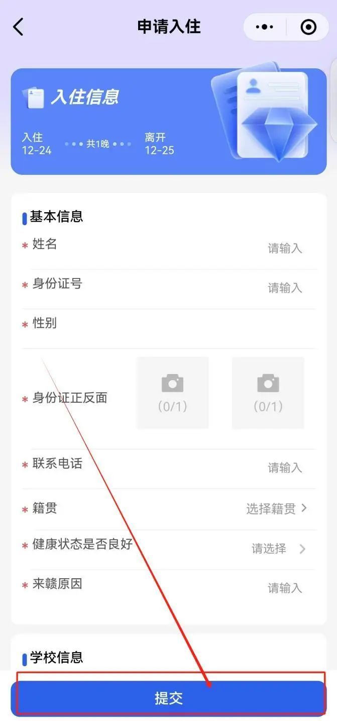 3.查看【驿站点地址】,选择【入住日期】查看【剩余床位】后,点击【入住申请】,填写【入住信息】后点击【提交】。
