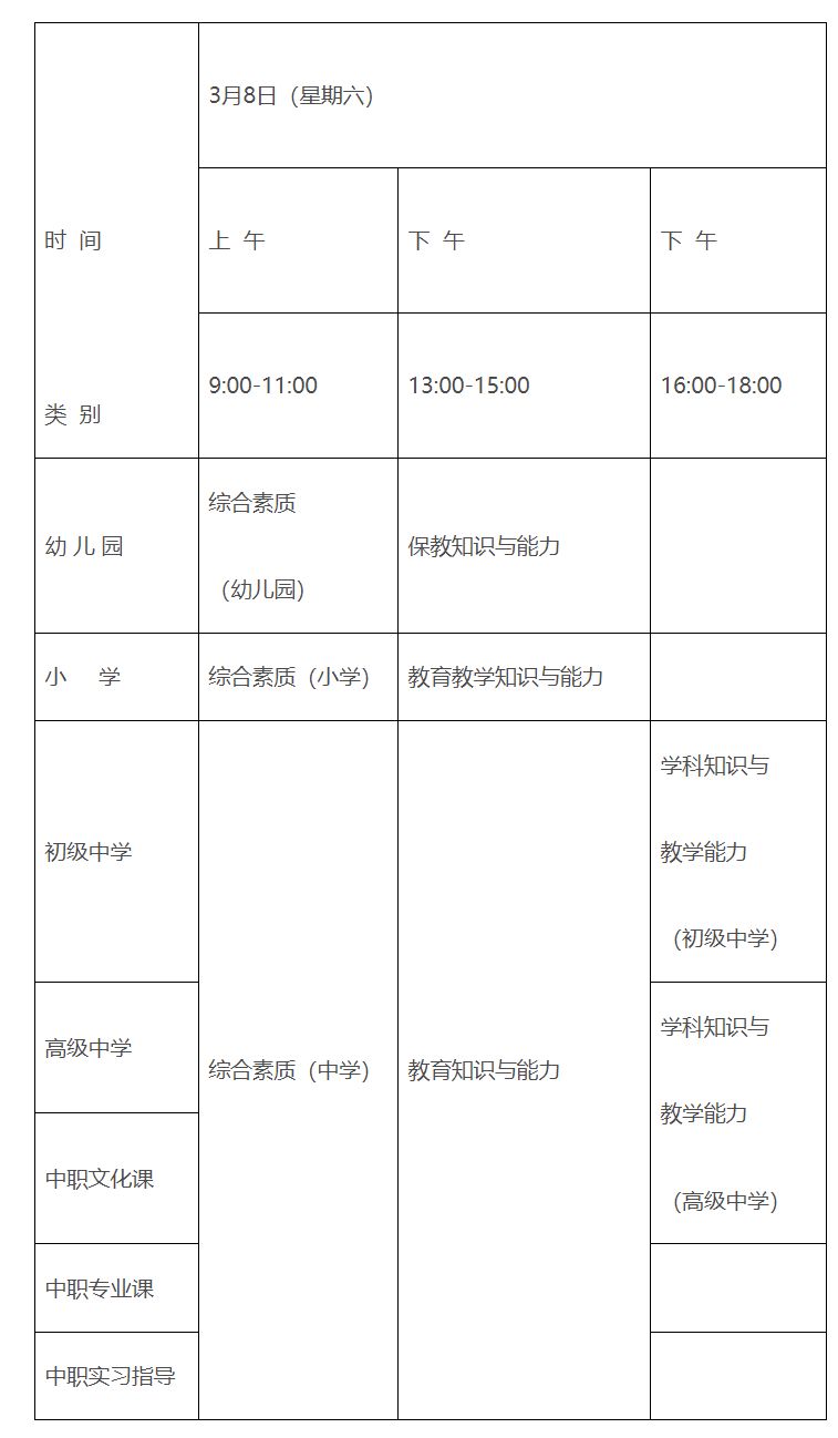 5. 考试安排: - 3月13日:综合素质、教育知识与能力; - 3月14日:学科知识与教学能力。