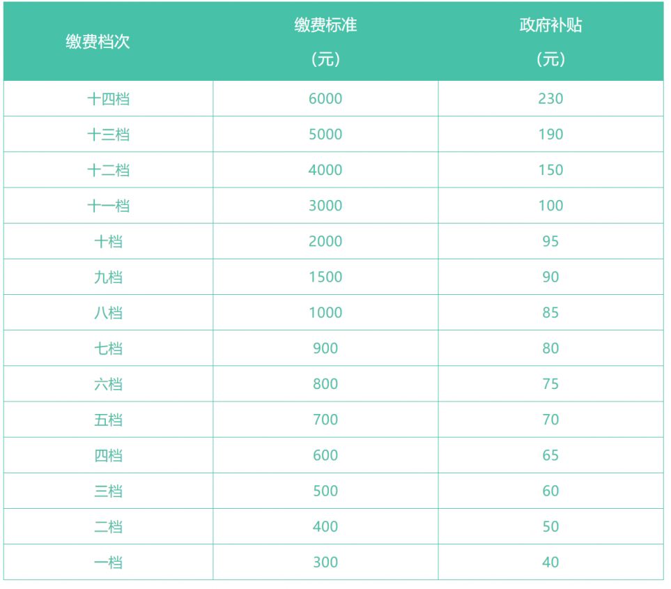 2. 补贴标准:财政补贴标准按照参保人选择的缴费档次确定,具体如下: - 100元档次:补贴40元; - 200元档次