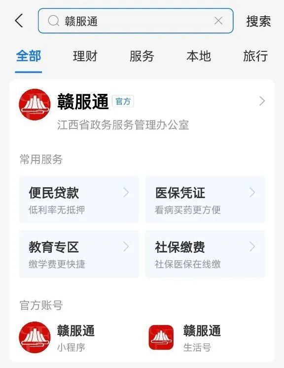 1.支付宝搜索“赣服通”或应用市场下载“赣服通”APP进入平台。
