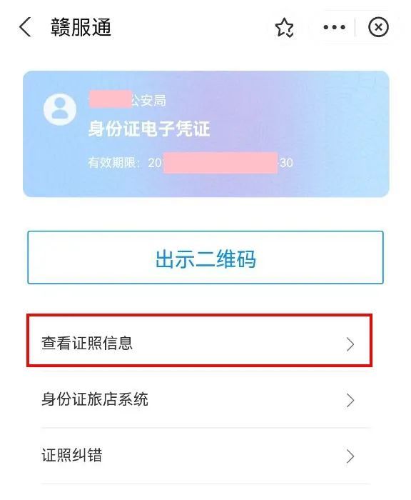 3.根据要求选择功能,点击查看证照信息,可在公安巡逻盘查时出示。点击身份证旅店系统,出示二维码给工作人员,可用于酒店、网吧办理登记。